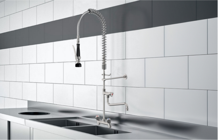 2. Pre Rinse Faucet (European/American Styles): Constructed entirely of stainless steel for durability and lead-free safety, this faucet features a unique anti-tangle hose paired with a patented dual-function spray valve, working together to reduce operator effort by up to 75%, making extended cleaning tasks significantly easier.